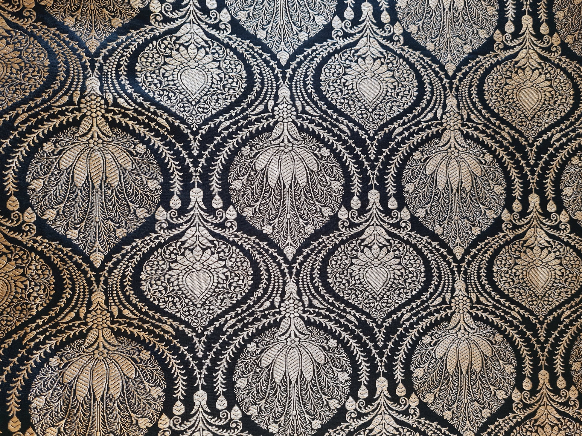 This elegant Black Mashru Katan silk saree, featuring a subtle rose gold border, embodies timeless sophistication. The soft, luxurious fabric is elevated by a light golden yellow tint, enhancing its vibrant allure. Delicate Jhumkhis scattered across the body add a touch of charm, while intricate rose gold Zari work on the pallu adds refinement. Paired with a plain self-blouse, this saree radiates grace and luxury, making it an ideal choice for those who appreciate true elegance.