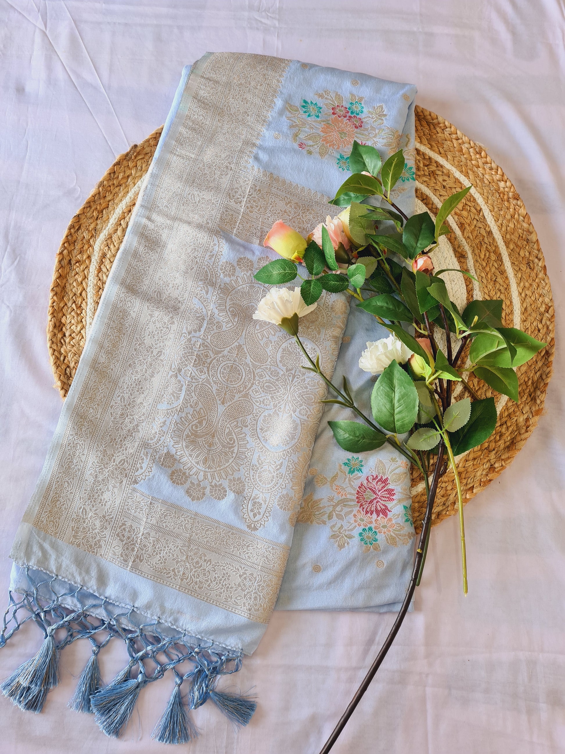 This Elegant Tussar Georgette Saree floral work saree combines timeless charm with regal sophistication. The intricate zari border and self-running blouse fabric add a royal touch. Available in four stunning colors—sky blue, powder blue, baby pink, and off white—this saree is a true masterpiece.