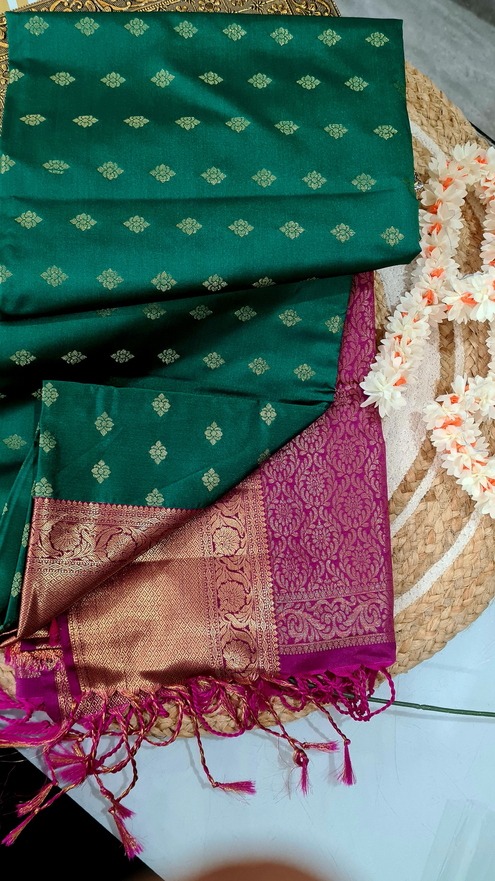 Green Soft Silk serves as the base of this saree, showcasing a soft and elegant texture. The Rani Pink border is adorned with tested Zari work, adding to its sophisticated appearance. The luxurious soft silk allows for comfortable wearing and carrying, making it suitable for any occasion with its rich and high-quality design.