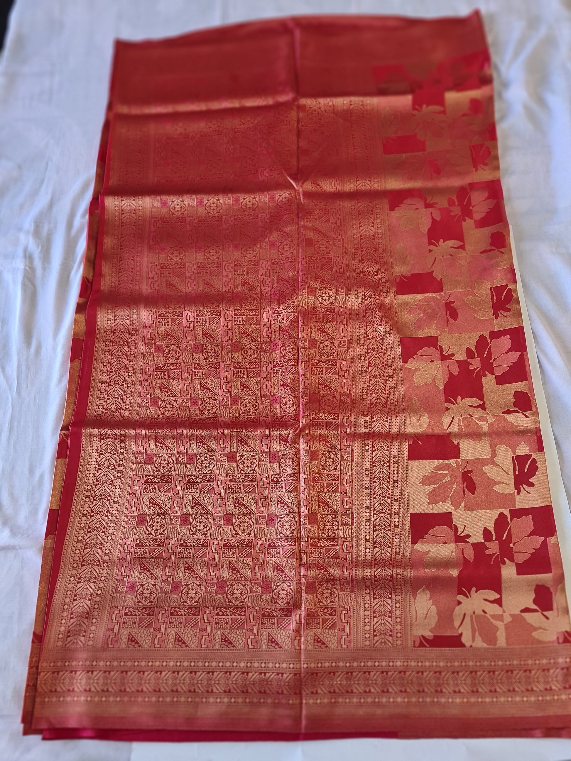 Ruby pink soft jacquard silk is a truly stunning, luxurious fabric, showcasing a beautiful geometric design all over, with delicate gold threads weaving intricate patterns. The soft tissue texture is complemented by an elegant border, crafted using a special loom technique. This exquisite saree is perfect for weddings, housewarming ceremonies, and festivals, adding a touch of graIn addition to the above, we are delighted to offer a stunning Cerulean-Sapphire blue saree as another beautiful option.ce and sophistication to any occasion.