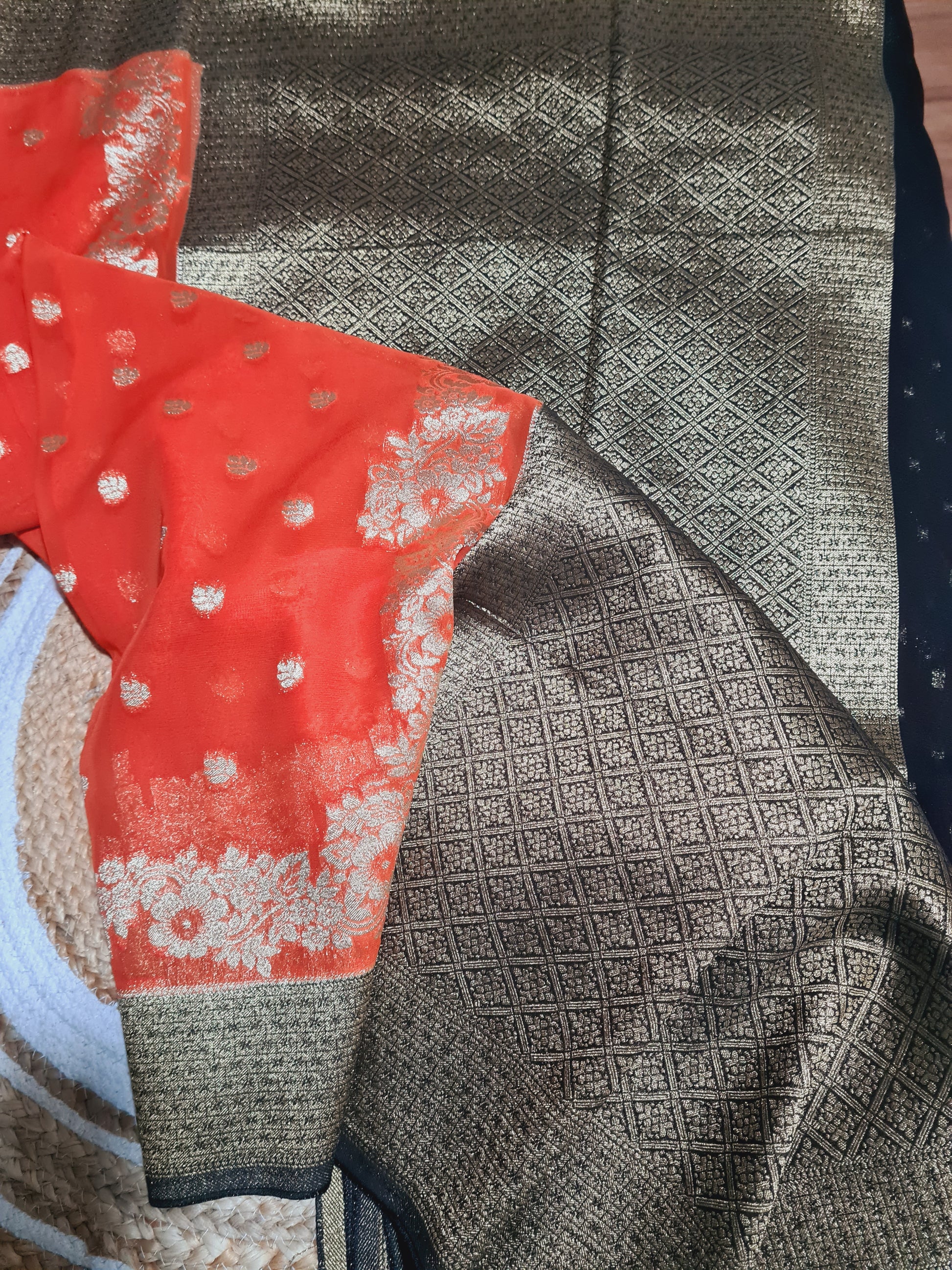 Elevate your ethnic wardrobe with this exquisite Orange Pure Chiffon Saree, featuring delicate golden zari buttas that add a subtle shimmer to the flowing fabric. The contrasting black border enhances the saree's elegance, creating a striking balance with the vibrant orange. Paired with a sophisticated black blouse adorned with tiny golden zari buttis throughout, this ensemble offers a timeless blend of tradition and modernity. Perfect for festive occasions and celebrations, this saree ensures comfort without compromising on style, embodying impeccable craftsmanship and refined taste.