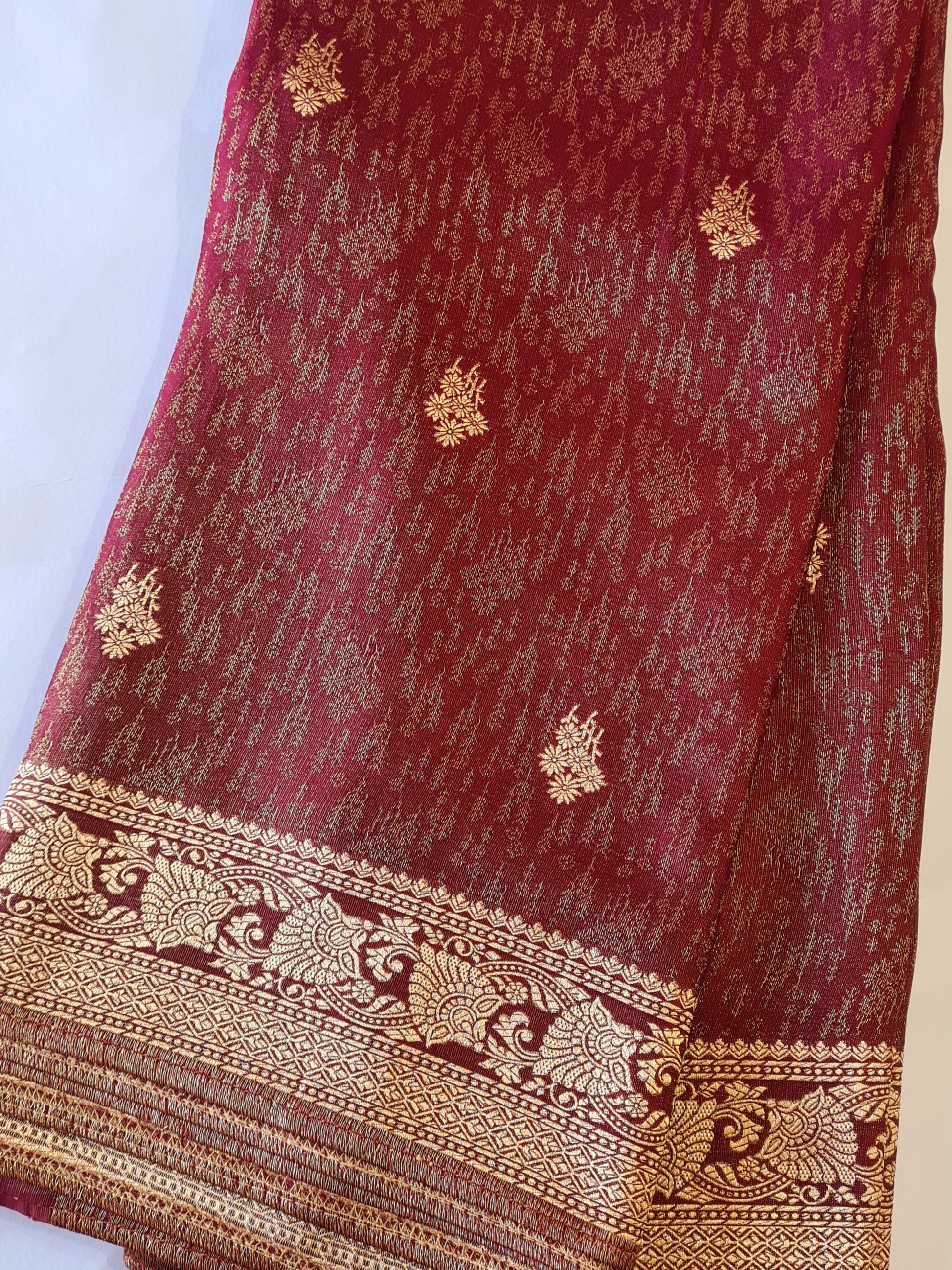 Pure Mashru Zari sarees are the epitome of luxury, offering an incredibly soft, skin-friendly feel while exuding richness. Intricate zari designs embellish the entire body, complemented by a graceful silver-gold border that allows the pleats to fall elegantly. The plain blouse with a zari border on the sleeves further enhances the saree's beauty. This saree radiates royalty, sophistication, and opulence. Available in seven majestic hues: Regal Magic Mauve, Gleaming Golden Yellow, Exquisite Precious Pista Green, Dazzling Radiant Rust, Luxurious Opulent Peach, Majestic Peacock Blue, and Vibrant Royal Blue, each color adds a touch of regal splendor to your wardrobe.
