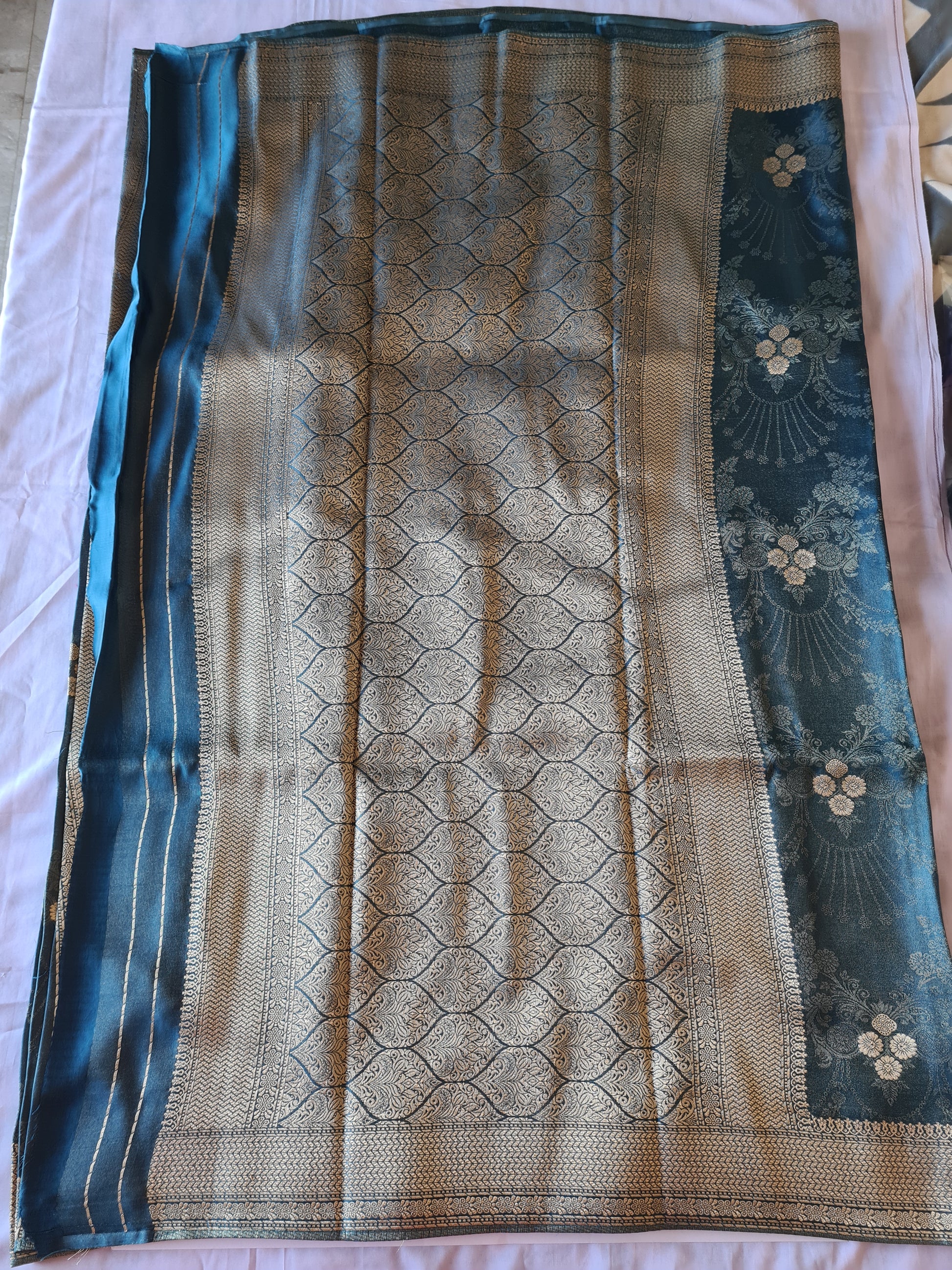 Pure Mashru Zari sarees are the epitome of luxury, offering an incredibly soft, skin-friendly feel while exuding richness. Intricate zari designs embellish the entire body, complemented by a graceful silver-gold border that allows the pleats to fall elegantly. The plain blouse with a zari border on the sleeves further enhances the saree's beauty. This saree radiates royalty, sophistication, and opulence. Available in seven majestic hues: Regal Magic Mauve, Gleaming Golden Yellow, Exquisite Precious Pista Green, Dazzling Radiant Rust, Luxurious Opulent Peach, Majestic Peacock Blue, and Vibrant Royal Blue, each color adds a touch of regal splendor to your wardrobe.
