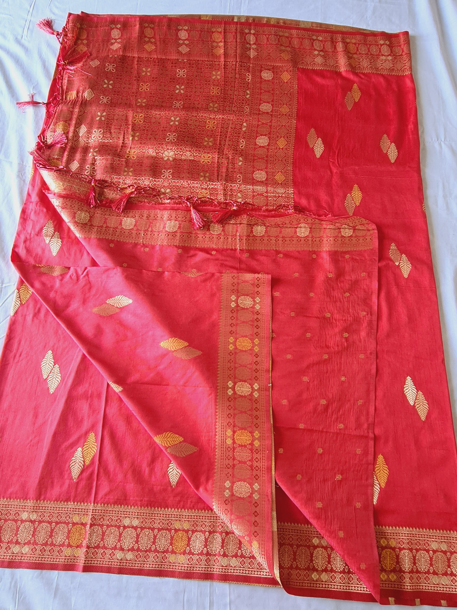 This exquisite Red Raw silk offers exceptional comfort and drapeability. The saree features elegant dual-toned golden leaf motifs throughout, complemented by a sophisticated golden border that enhances its refined appearance. Its luxurious pallu significantly elevates the saree's overall aesthetic appeal and desirability. Perfectly suited for various occasions, both intimate and grand, this versatile piece ensures daylong comfort without compromising on elegance.