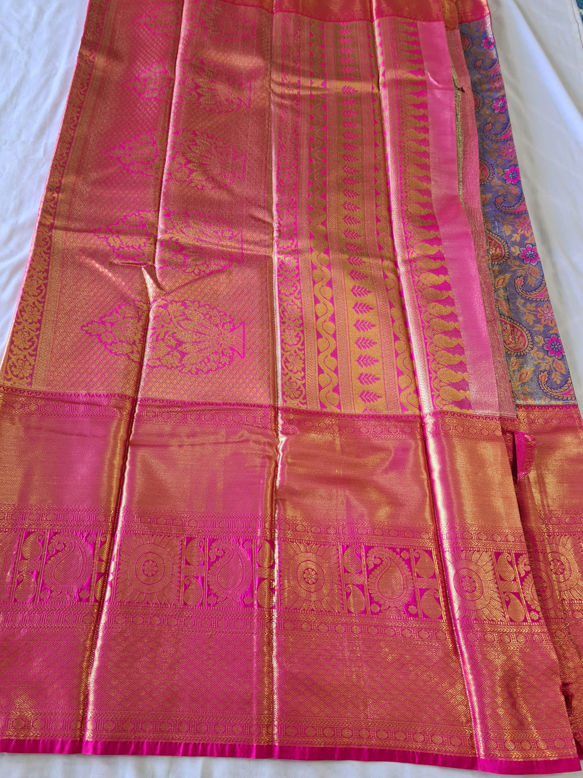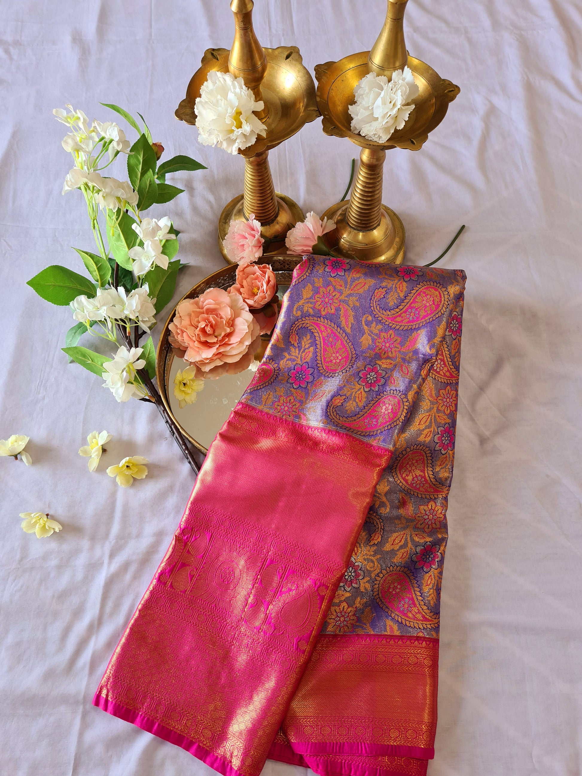 Expertly crafted with delicate Zari thread work, this Semi Kanchi Soft silk Purple & Pink Mango saree boasts an elegant mango design that exudes sophistication and class. With its intricate details and impeccable quality, this saree is a must-have for any fashion-forward individual. Elevate your wardrobe with this timeless and versatile piece that will make you stand out with its unique charm and refined appeal.
