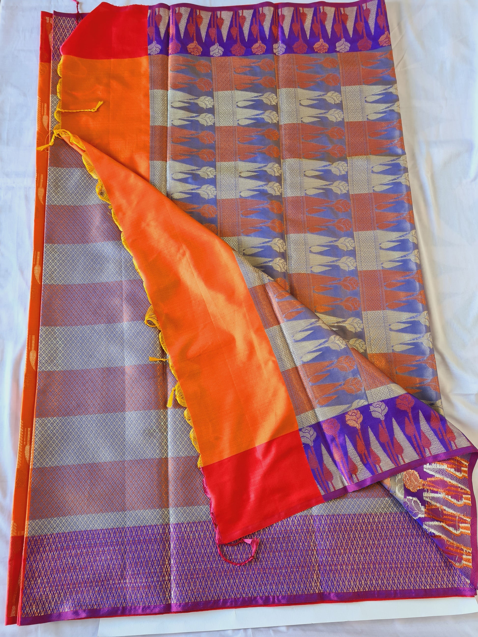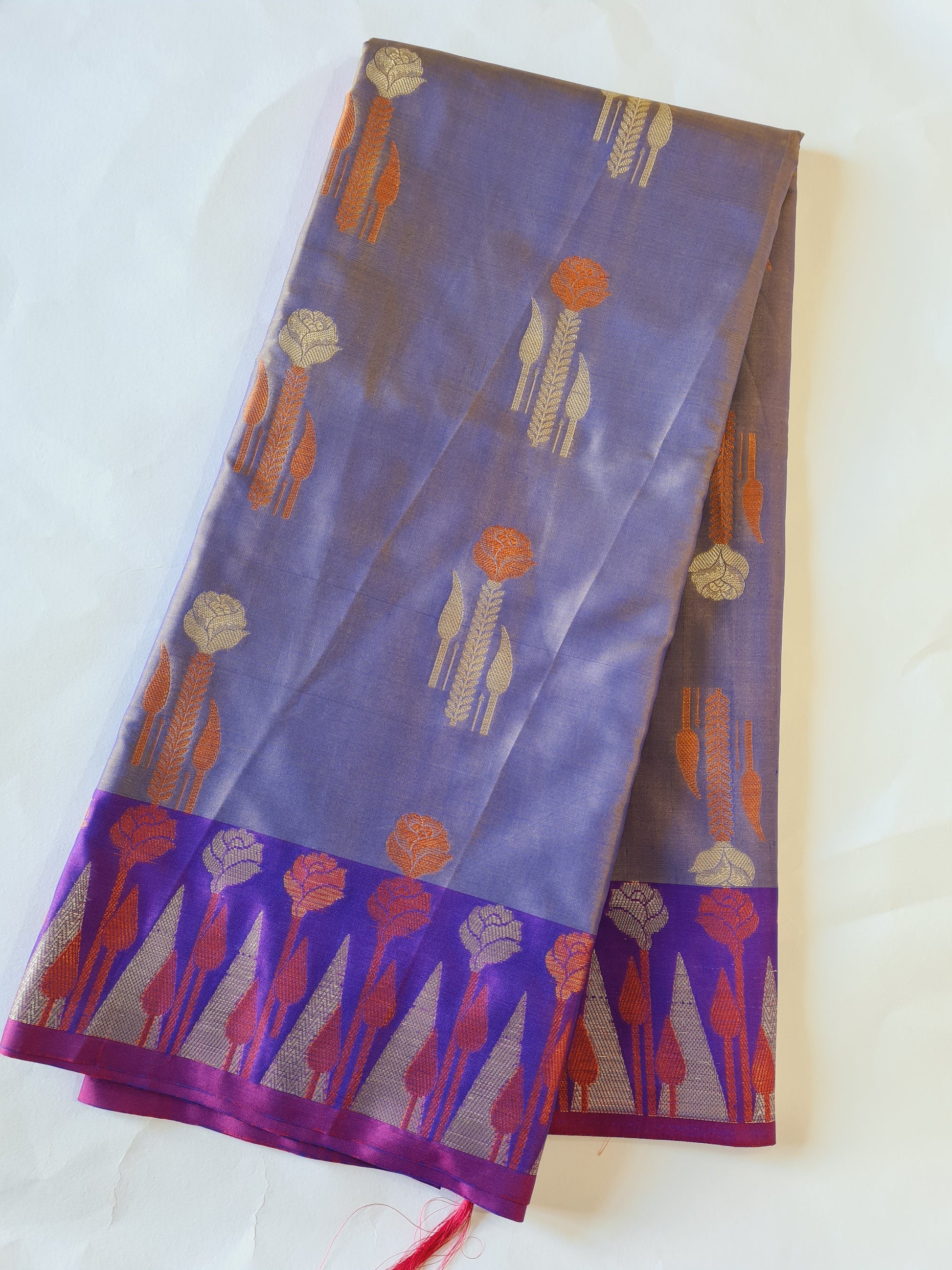 This Lavender Semi Katan soft tissue saree exudes a gentle, refreshing charm. The fabric is luxuriously soft and drapes effortlessly, ensuring a graceful look with every wear. The contemporary Orange blouse piece with a delicate border adds a subtle yet stylish touch, making it perfect for intimate events. Its understated elegance and serene vibe make it an ideal choice for those seeking a sophisticated, low-key yet beautiful ensemble for small gatherings.