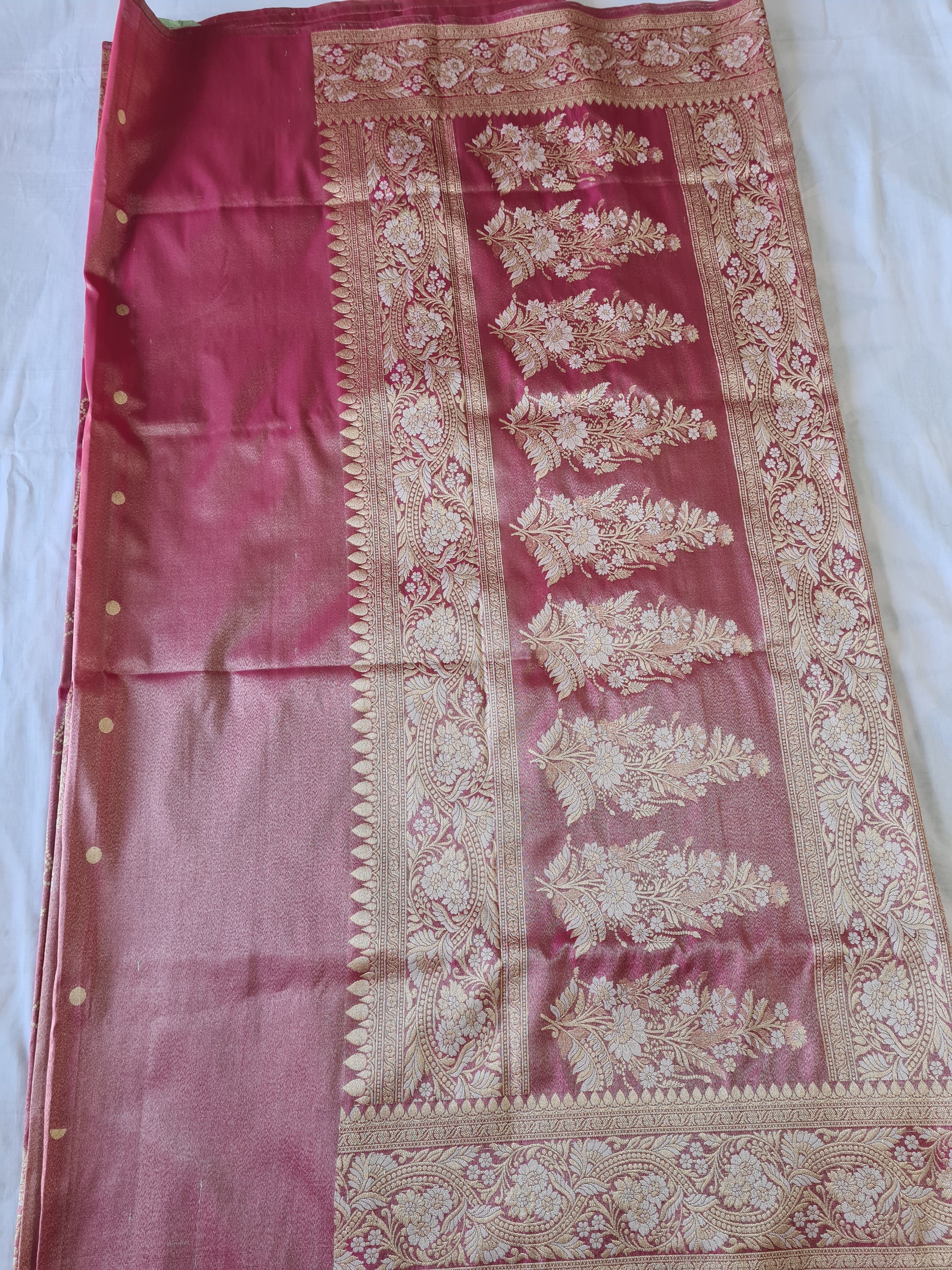 A stunning Lavender Pink saree adorned with intricate meenakari designs, woven with golden tissue threads. Crafted from soft, easy-to-drape fabric, it adds an elegant and graceful touch to you. As usual Comes with Blouse fabric, too.